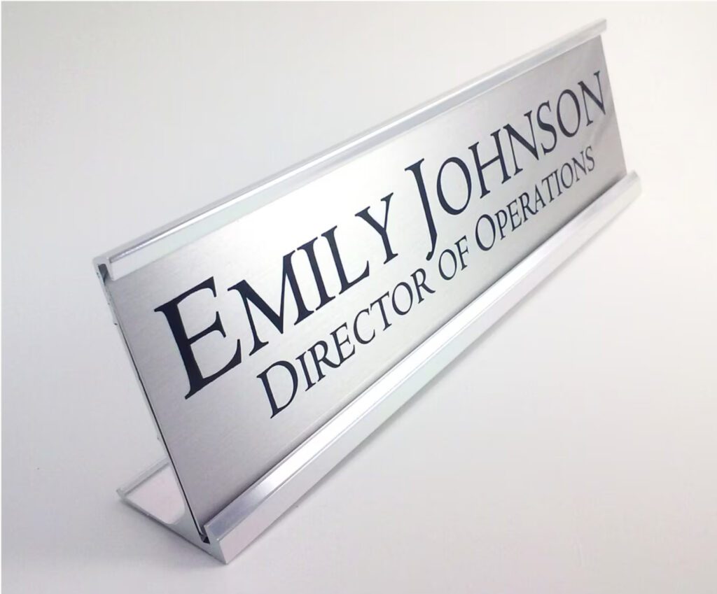 A nameplate is a small sign or plaque that displays someone’s name or title. It is often used to identify people or things in various settings, such as on office desks, doors, cubicles, or even on personal belongings. Nameplates can be made from a variety of materials, including steel, acrylic, brass, or wood, and are commonly used for identification purposes. We design a wide range of nameplates on various materials, such as: